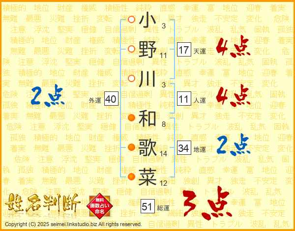 小(3画)野(11画)川(3画) 和(8画)歌(14画)菜(12画)