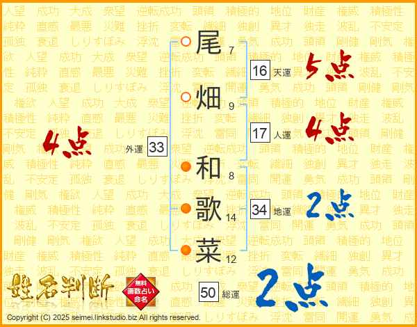 尾(7画)畑(9画) 和(8画)歌(14画)菜(12画)