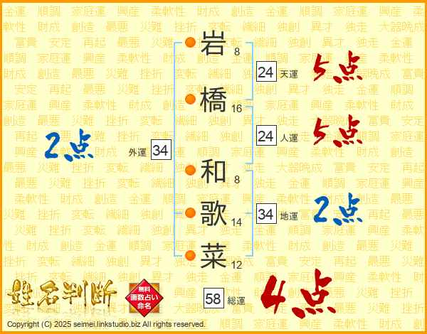 岩(8画)橋(16画) 和(8画)歌(14画)菜(12画)