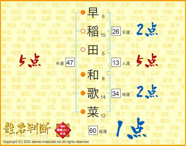 早(6画)稲(15画)田(5画) 和(8画)歌(14画)菜(12画)