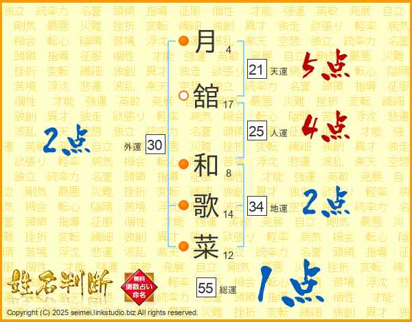 月(4画)舘(17画) 和(8画)歌(14画)菜(12画)