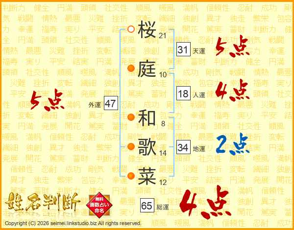 桜(21画)庭(10画) 和(8画)歌(14画)菜(12画)