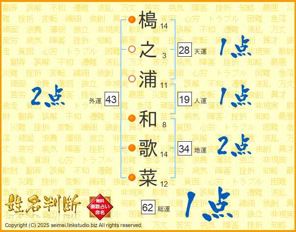 生活面を象徴する運勢です。外部から受ける影響力を表し、結婚運、家庭運や職場、環境への順応性を表します。総運から人運を引いた画数。姓や名が1文字の場合を除く。