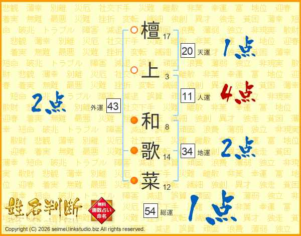 檀(17画)上(3画) 和(8画)歌(14画)菜(12画)