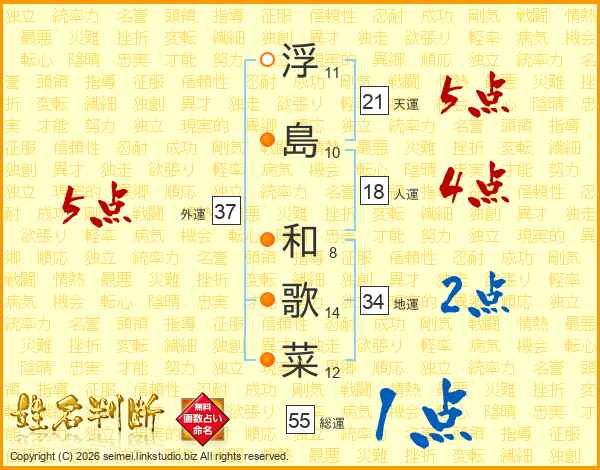 浮(11画)島(10画) 和(8画)歌(14画)菜(12画)