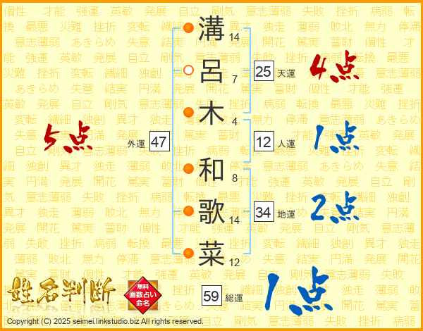 溝(14画)呂(7画)木(4画) 和(8画)歌(14画)菜(12画)