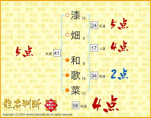 漆(15画)畑(9画) 和(8画)歌(14画)菜(12画)