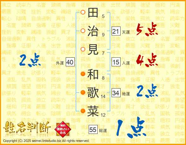 田(5画)治(9画)見(7画) 和(8画)歌(14画)菜(12画)