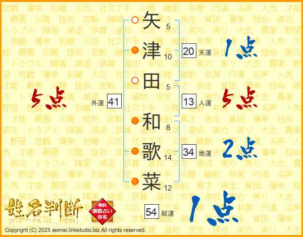 矢(5画)津(10画)田(5画) 和(8画)歌(14画)菜(12画)