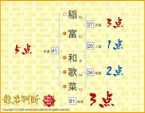 稲(15画)富(12画) 和(8画)歌(14画)菜(12画)