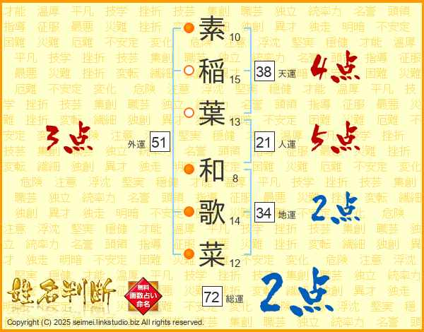 素(10画)稲(15画)葉(13画) 和(8画)歌(14画)菜(12画)