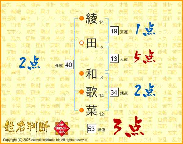 綾(14画)田(5画) 和(8画)歌(14画)菜(12画)