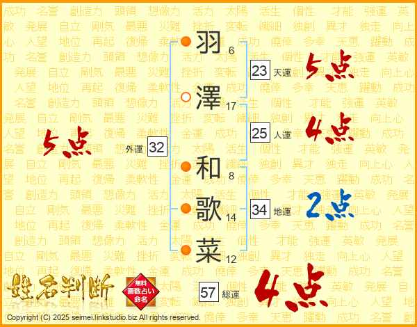 羽(6画)澤(17画) 和(8画)歌(14画)菜(12画)