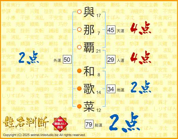與(17画)那(7画)覇(21画) 和(8画)歌(14画)菜(12画)