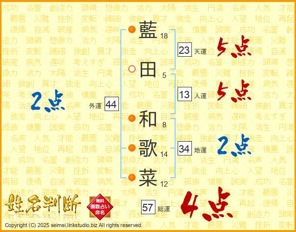 藍(18画)田(5画) 和(8画)歌(14画)菜(12画)