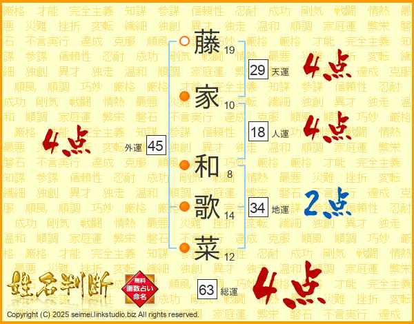 藤(19画)家(10画) 和(8画)歌(14画)菜(12画)