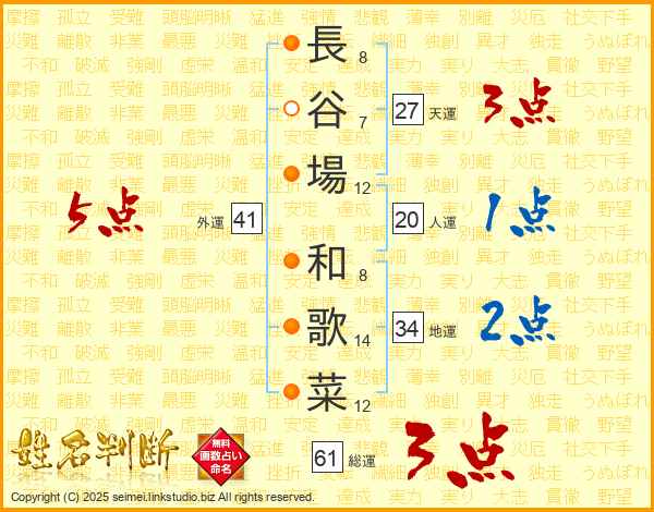 長(8画)谷(7画)場(12画) 和(8画)歌(14画)菜(12画)