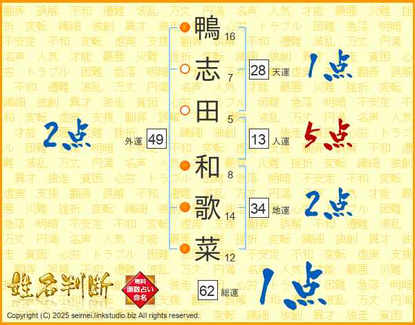 鴨(16画)志(7画)田(5画) 和(8画)歌(14画)菜(12画)