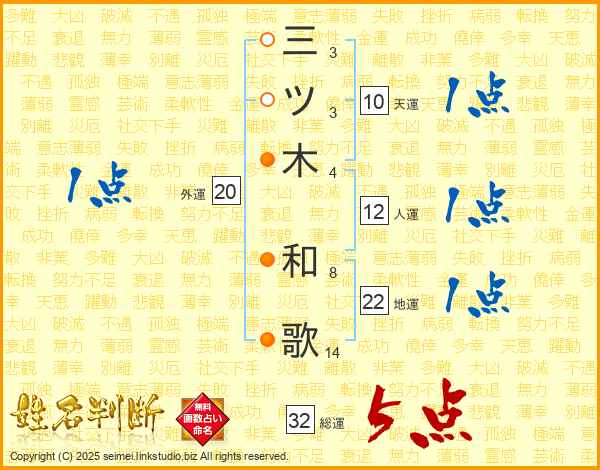 三(3画)ツ(3画)木(4画) 和(8画)歌(14画)
