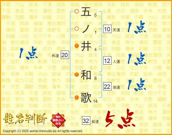 五(5画)ノ(1画)井(4画) 和(8画)歌(14画)
