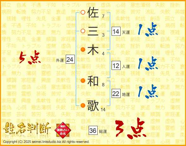 佐(7画)三(3画)木(4画) 和(8画)歌(14画)