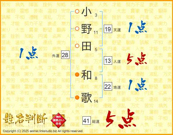 小(3画)野(11画)田(5画) 和(8画)歌(14画)