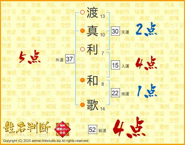 渡(13画)真(10画)利(7画) 和(8画)歌(14画)