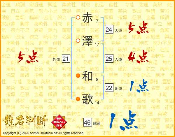 赤澤和歌さんの総運は46画の1点!