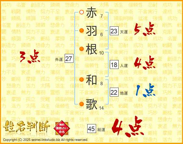 赤(7画)羽(6画)根(10画) 和(8画)歌(14画)