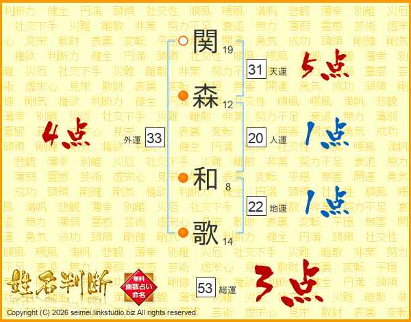 生活面を象徴する運勢です。外部から受ける影響力を表し、結婚運、家庭運や職場、環境への順応性を表します。総運から人運を引いた画数。姓や名が1文字の場合を除く。