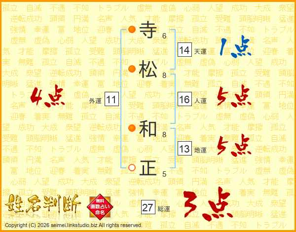 生活面を象徴する運勢です。外部から受ける影響力を表し、結婚運、家庭運や職場、環境への順応性を表します。総運から人運を引いた画数。姓や名が1文字の場合を除く。