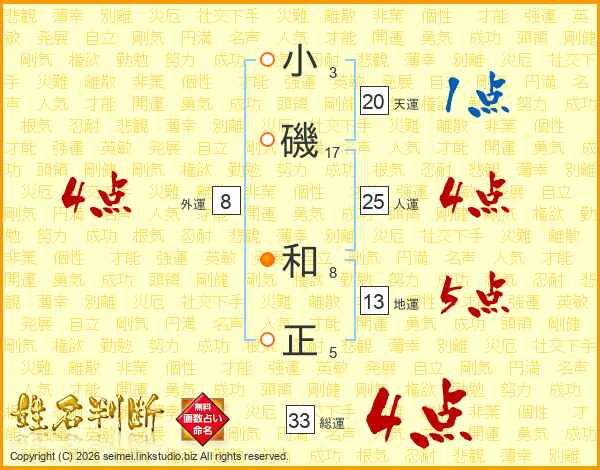 生活面を象徴する運勢です。外部から受ける影響力を表し、結婚運、家庭運や職場、環境への順応性を表します。総運から人運を引いた画数。姓や名が1文字の場合を除く。