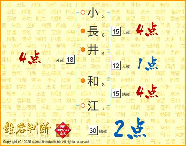 小(3画)長(8画)井(4画) 和(8画)江(7画)