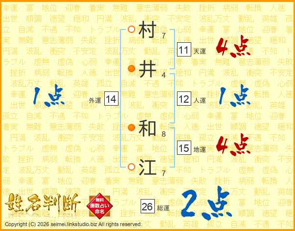 生活面を象徴する運勢です。外部から受ける影響力を表し、結婚運、家庭運や職場、環境への順応性を表します。総運から人運を引いた画数。姓や名が1文字の場合を除く。