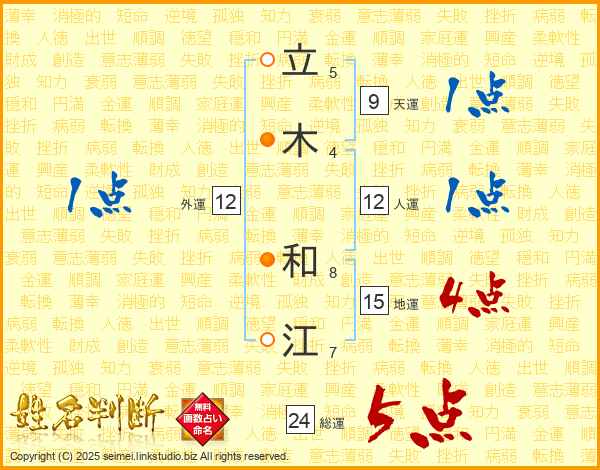 生活面を象徴する運勢です。外部から受ける影響力を表し、結婚運、家庭運や職場、環境への順応性を表します。総運から人運を引いた画数。姓や名が1文字の場合を除く。