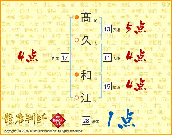 生活面を象徴する運勢です。外部から受ける影響力を表し、結婚運、家庭運や職場、環境への順応性を表します。総運から人運を引いた画数。姓や名が1文字の場合を除く。