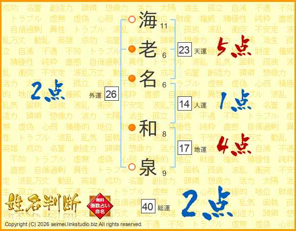 海(11画)老(6画)名(6画) 和(8画)泉(9画)