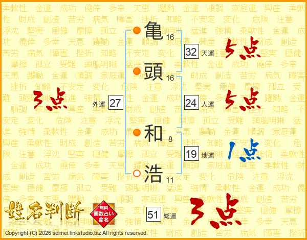 亀(16画)頭(16画) 和(8画)浩(11画)