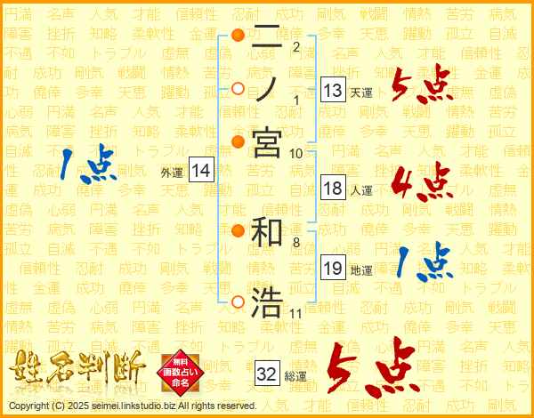 二(2画)ノ(1画)宮(10画) 和(8画)浩(11画)