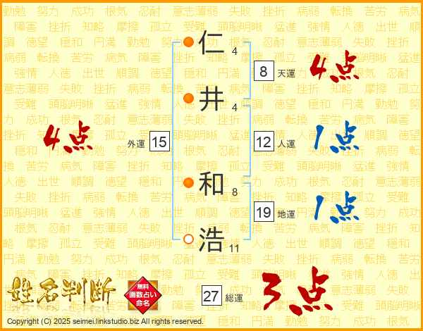 仁(4画)井(4画) 和(8画)浩(11画)