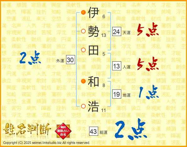 伊(6画)勢(13画)田(5画) 和(8画)浩(11画)