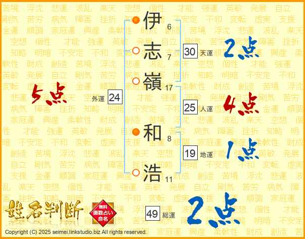 伊(6画)志(7画)嶺(17画) 和(8画)浩(11画)