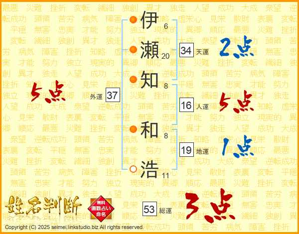 伊(6画)瀬(20画)知(8画) 和(8画)浩(11画)