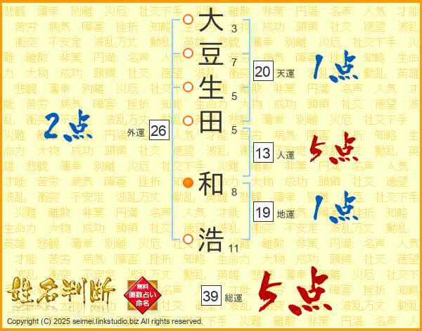 大(3画)豆(7画)生(5画)田(5画) 和(8画)浩(11画)