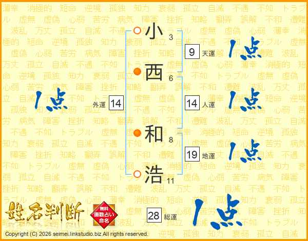 生活面を象徴する運勢です。外部から受ける影響力を表し、結婚運、家庭運や職場、環境への順応性を表します。総運から人運を引いた画数。姓や名が1文字の場合を除く。