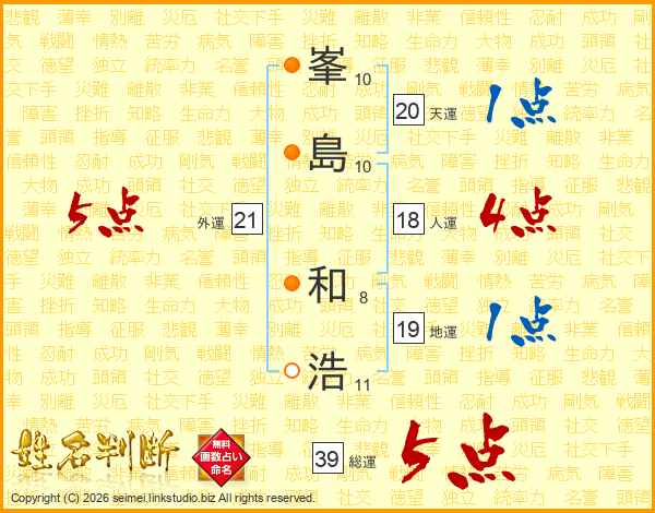 あなたの人生を表す1番重要な運勢です。生涯を通じて影響する総合運となり、主に50歳以降の晩年期に影響を及ぼします。苗字と名前の合計画数。