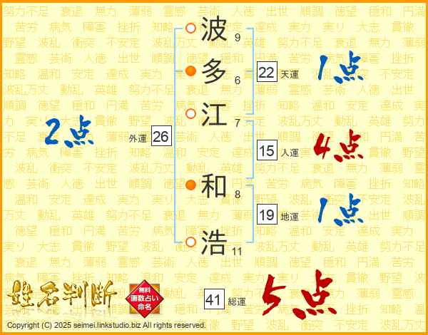 波(9画)多(6画)江(7画) 和(8画)浩(11画)