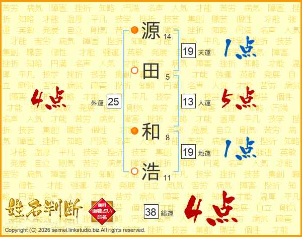 生活面を象徴する運勢です。外部から受ける影響力を表し、結婚運、家庭運や職場、環境への順応性を表します。総運から人運を引いた画数。姓や名が1文字の場合を除く。