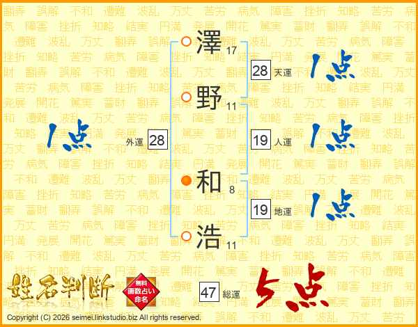 澤(17画)野(11画) 和(8画)浩(11画)