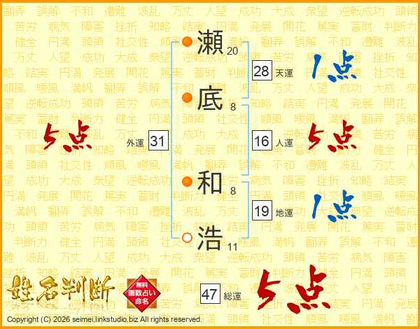 瀬(20画)底(8画) 和(8画)浩(11画)